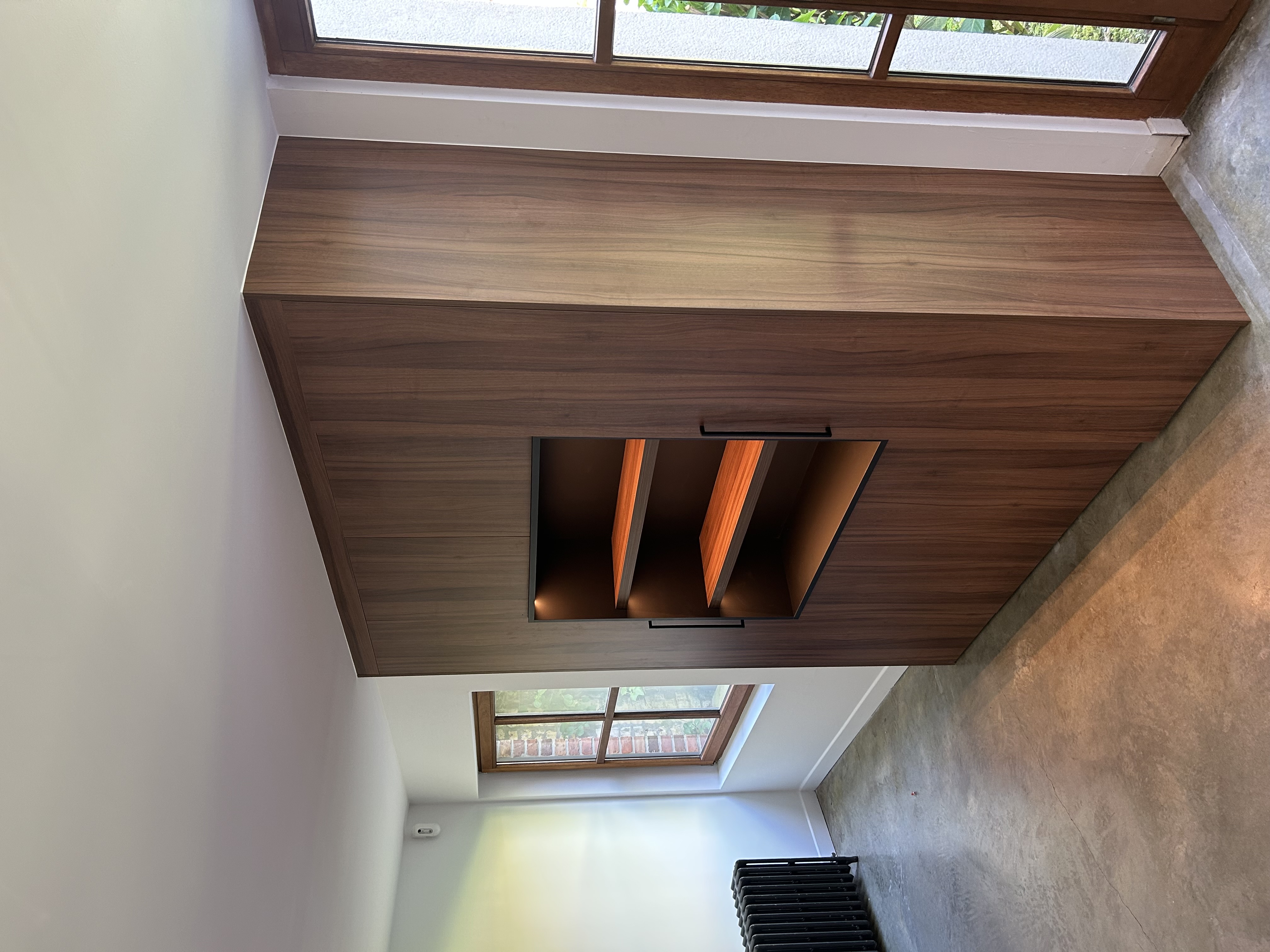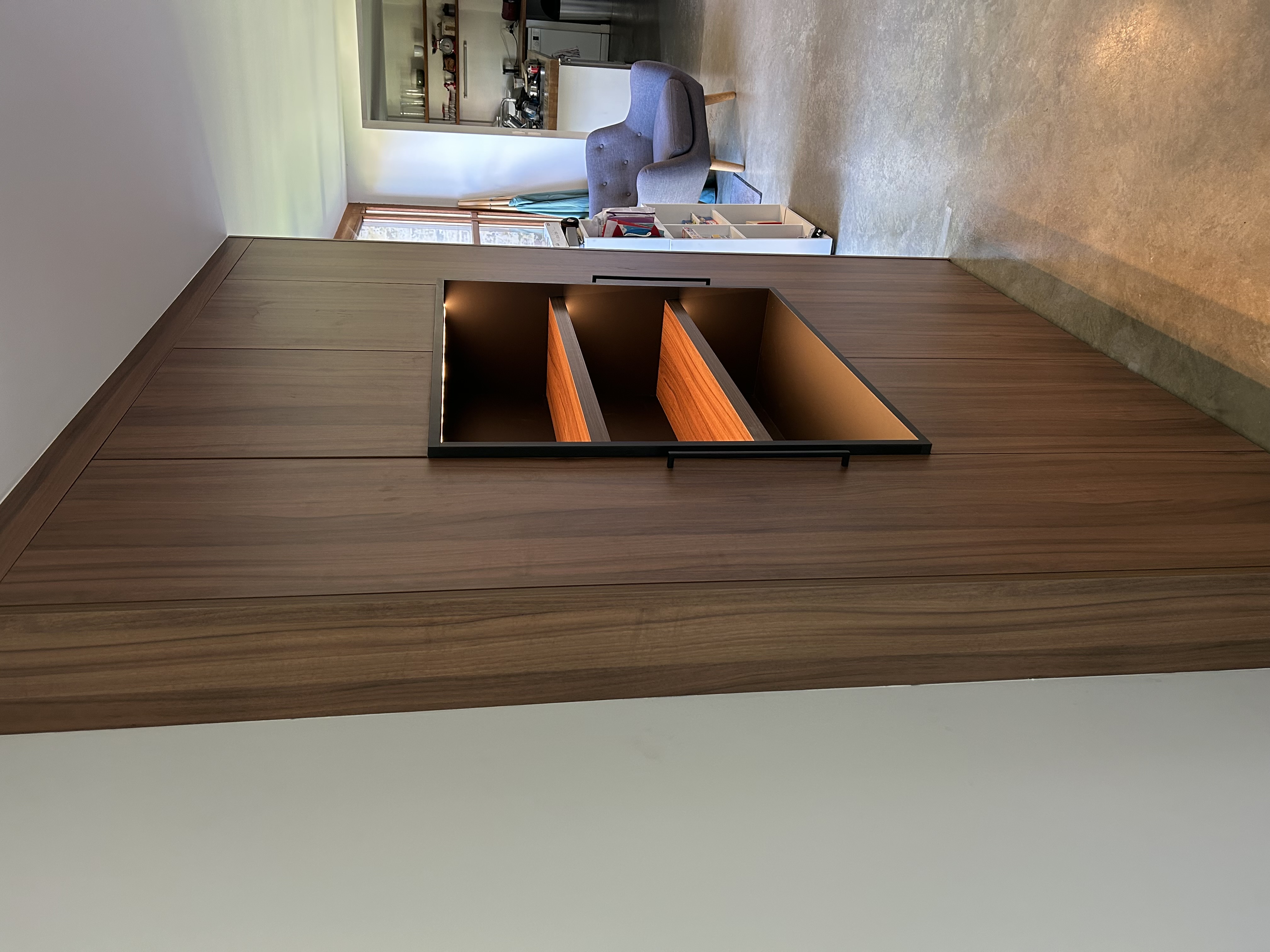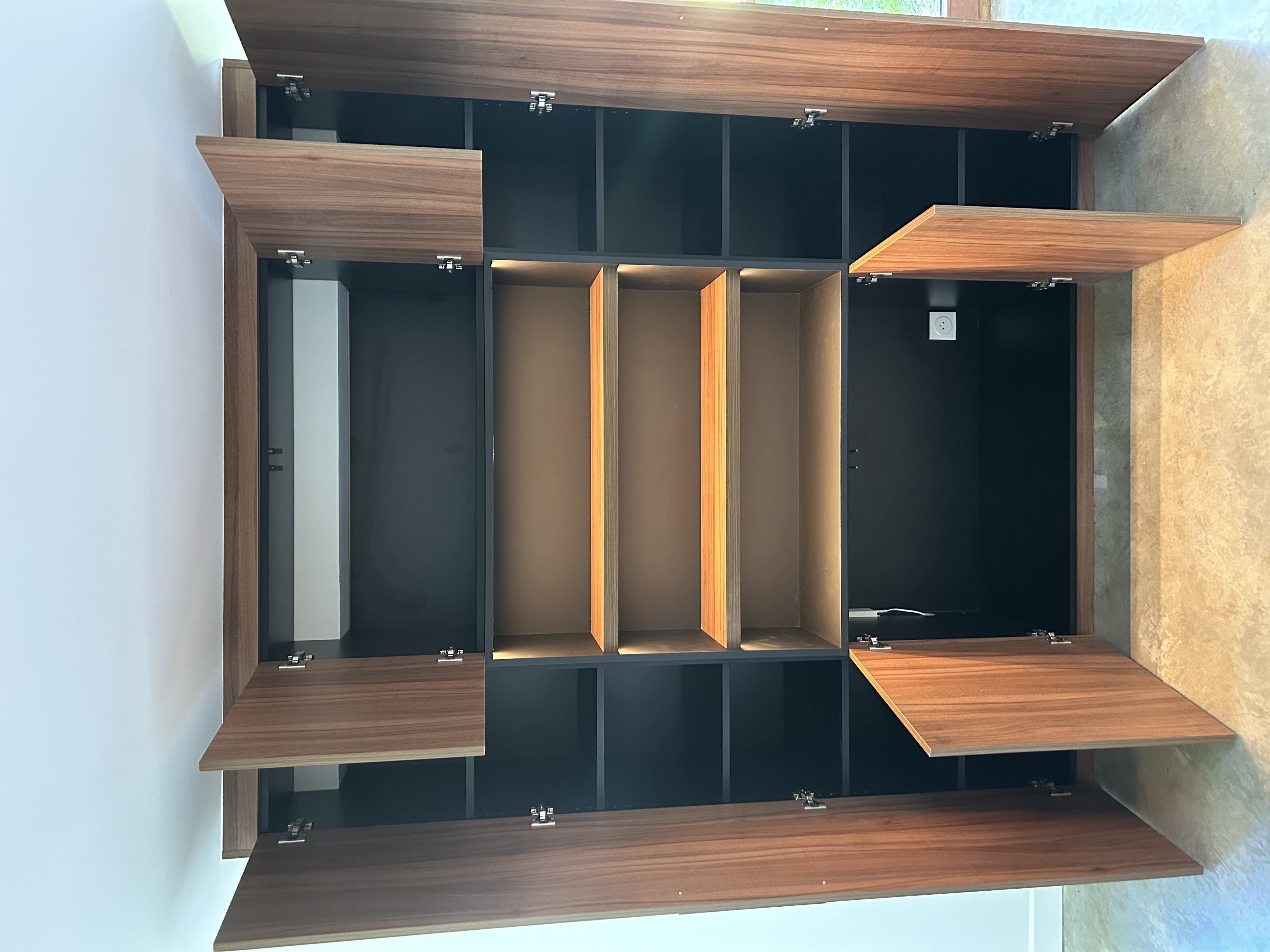 L’ensemble offre de nombreux rangements discrets tout en conservant une ligne épurée et parfaitement intégrée à l’espace.