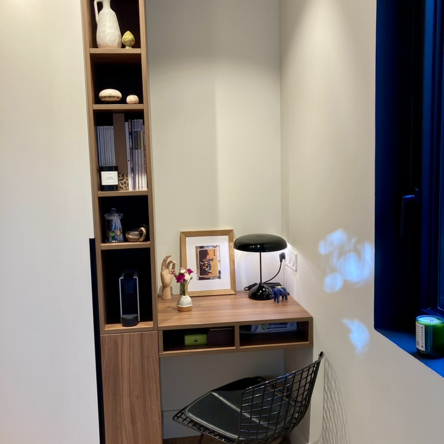 Un bureau sur mesure, assorti à l’ensemble, vient compléter l’aménagement pour créer un espace à la fois fonctionnel et chaleureux.