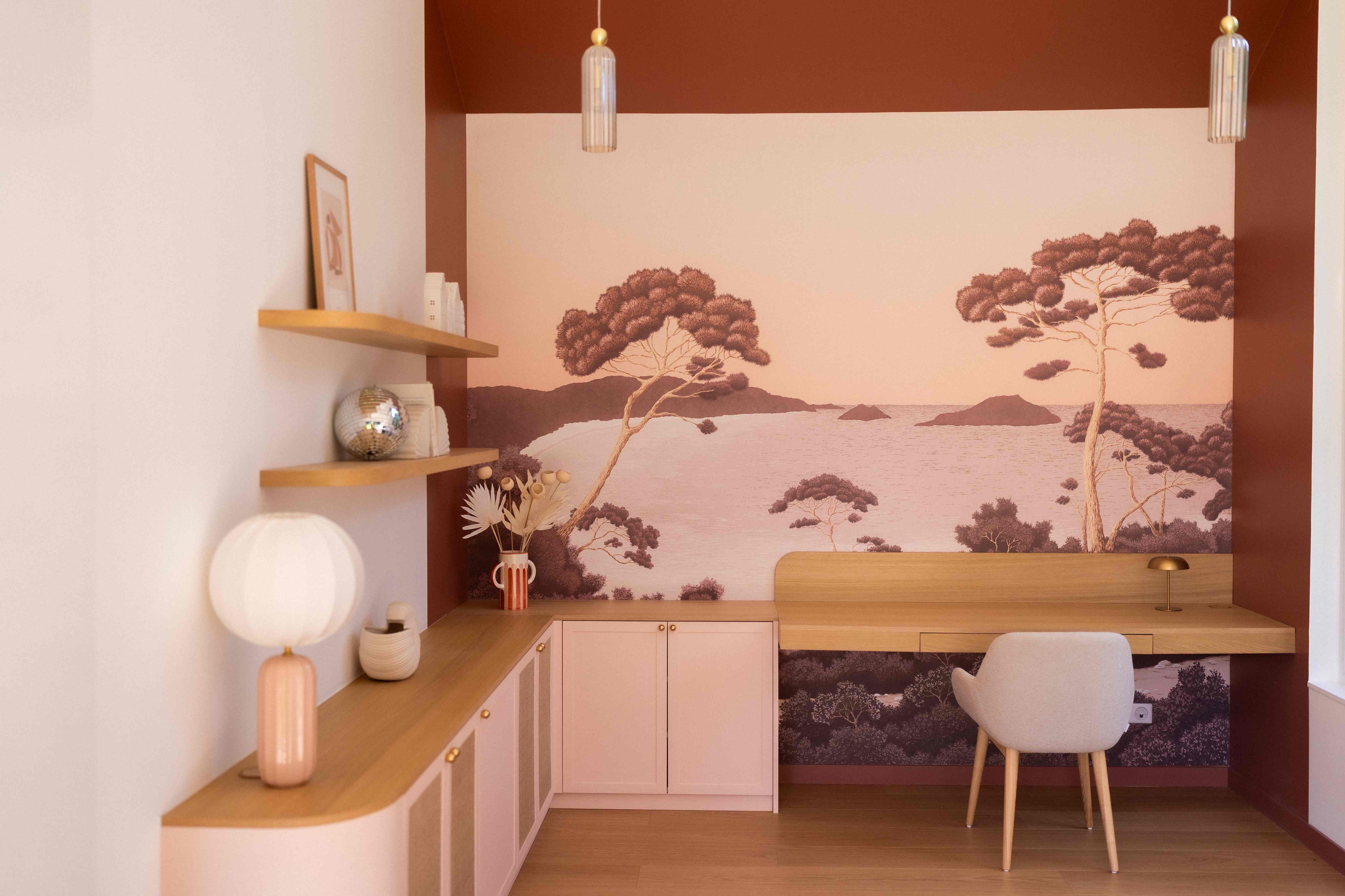 Réalisation d’un bureau sur mesure dans une chambre, complété par des étagères flottantes aux lignes arrondies. L’ensemble, en placage chêne et façades colorées, s’intègre harmonieusement au décor mural et crée un espace de travail chaleureux, apaisant et parfaitement fonctionnel. Les arrondis, les détails soignés et les volumes légers apportent une touche douce et raffinée à la pièce. Architecte du projet: Alchimie DECO