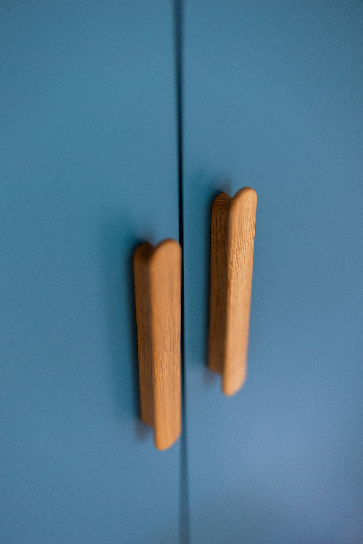 Le bureau se distingue par une teinte bleu intense, associée à des façades en finition bois naturel. Les petits boutons assortis renforcent l’harmonie de l’ensemble, tandis que la niche latérale et la grande surface de travail offrent un espace pratique et bien organisé. En arrière-plan, le mur jaune à motifs quadrillés apporte une touche graphique et chaleureuse qui dynamise parfaitement le mobilier. L’armoire sur mesure, habillée d’un bleu profond, s’intègre autour du lit superposé. L’ensemble forme un volume cohérent, pratique et visuellement fort. Les poignées en bois, sélectionnées pour leur douceur visuelle et leur ergonomie, ajoutent une note chaleureuse et naturelle. Enfin, le détail du bandeau supérieur en bois, découpé en motif festonné, apporte une touche poétique et ludique qui signe toute l’originalité du projet. Une réalisation où les couleurs audacieuses, les finitions laquées et les détails en bois créent une chambre douce, joyeuse et parfaitement adaptée à la vie des enfants.