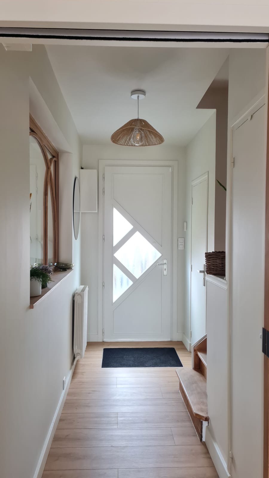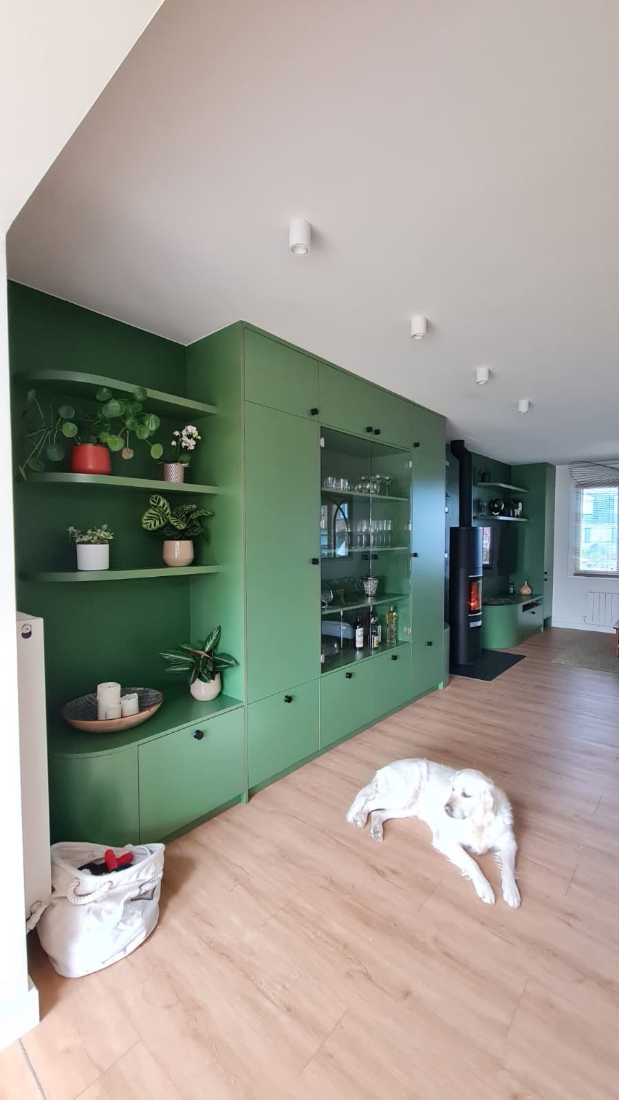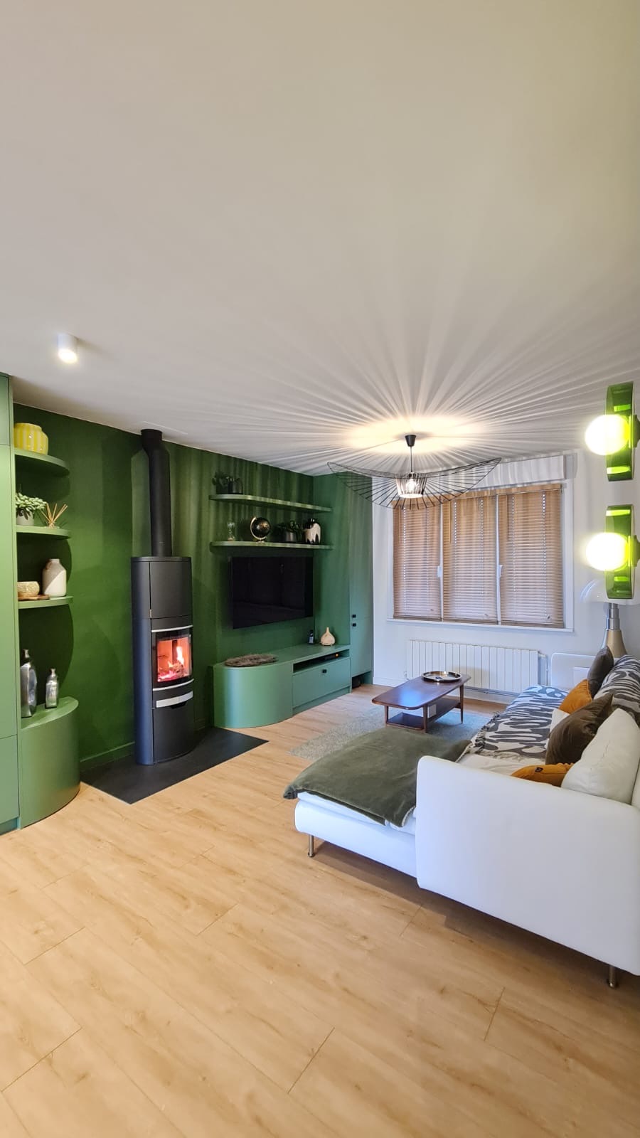 Bibliothèque sur mesure & verrière en chêne massif Cette réalisation illustre parfaitement notre approche du mobilier sur mesure, où esthétique, fonctionnalité et précision de fabrication se rencontrent. La pièce s’articule autour d’une double bibliothèque entièrement personnalisée, réalisée en mélaminé vert Polyrey, dont la teinte profonde structure l’espace et apporte une identité forte au séjour. Les formes arrondies stratifiées adoucissent les lignes et renforcent l’élégance de l’ensemble, tandis que les étagères flottantes créent un jeu de volumes léger et contemporain. La bibliothèque intègre deux portes vitrées, idéales pour mettre en valeur objets décoratifs et verrerie, tout en conservant une lecture visuelle fluide. Pensé pour un usage quotidien, le meuble comprend également : • des tiroirs renforcés spécialement conçus pour le stockage des bûches, à proximité du poêle, • un emplacement discret et dédié à l’aspirateur robot, assurant une intégration parfaite de la technique sans nuire à l’esthétique. En complément, nous avons réalisé une verrière intérieure en chêne massif, dessinée sur mesure. Le bois est protégé par une huile Rubio, qui sublime le veinage naturel du chêne tout en garantissant une protection durable. Cette verrière apporte de la lumière, structure les espaces et dialogue harmonieusement avec le mobilier sur mesure. Merci beaucoup à Faustine PARENT, architecte d’intérieur, pour le design du meuble (@agence.faustineparent sur Instagam)